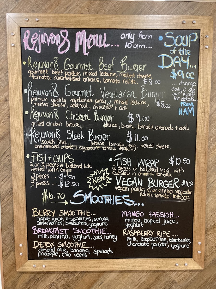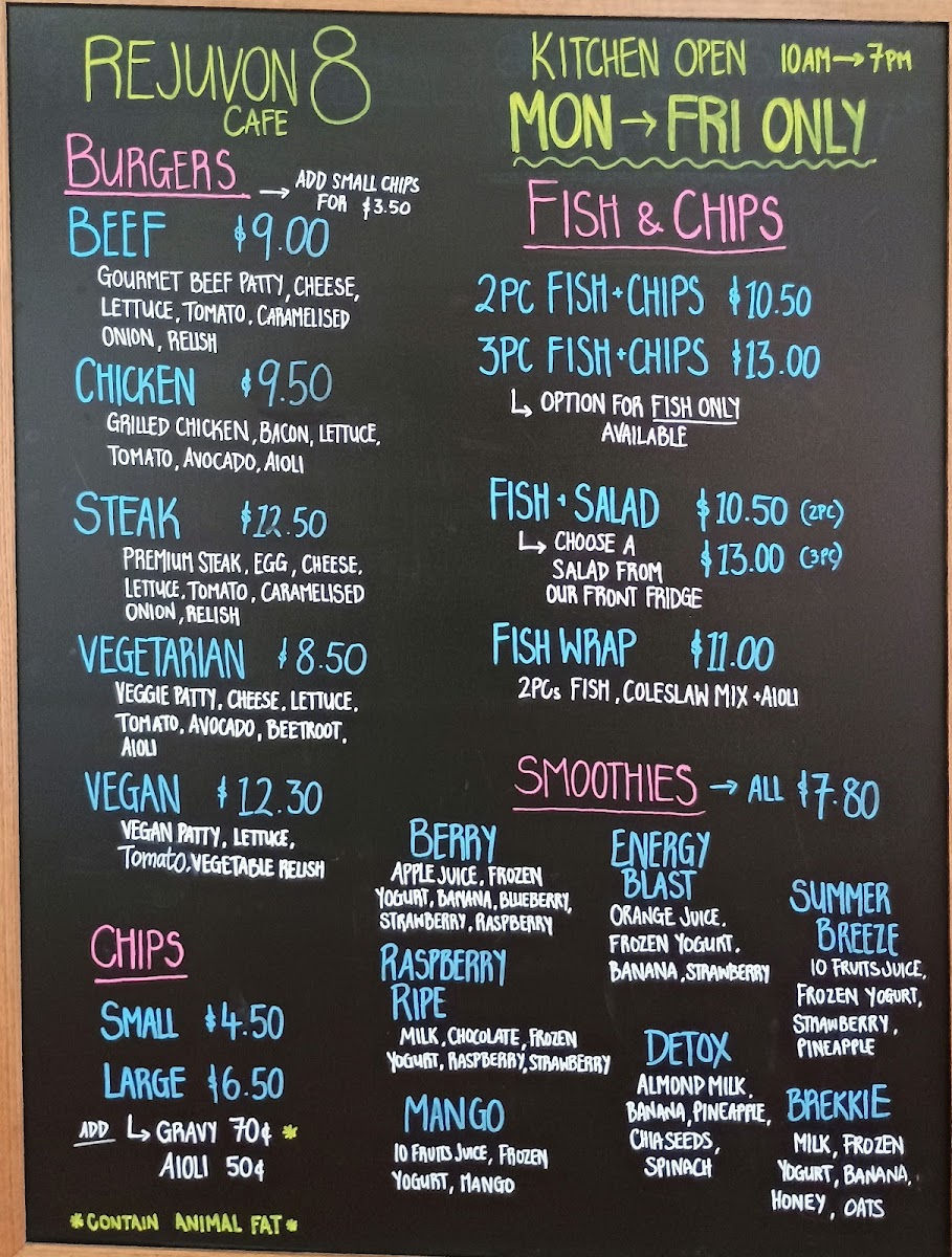 At Rejuvon8 Cafe, you can expect a diverse menu that caters to various tastes and dietary preferences. Indulge in satisfying burgers, including highlights like the succulent Beef Burger (A$9.00), which boasts a runny egg and relish that melts in your mouth, or the hearty Vegan Burger (A$12.30), crafted for those looking for plant-based nourishment. Pair your meal with a portion of golden, crispy Chips (A$4.50) for a delightful crunch.