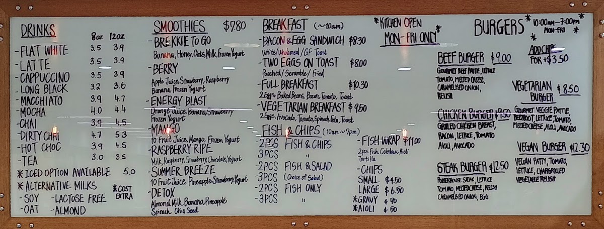 If you’re in the mood for something refreshing, try one of the vibrant Smoothies, such as the Berry or Mango, both of which are perfect for rejuvenating your spirit during a busy day. For those seeking a lighter option, the Fish Wrap (A$11.00) is highly recommended, offering a burst of flavors that will leave you feeling satisfied without the heaviness.